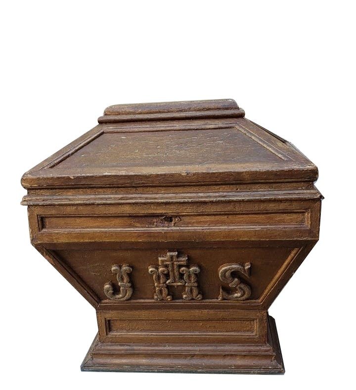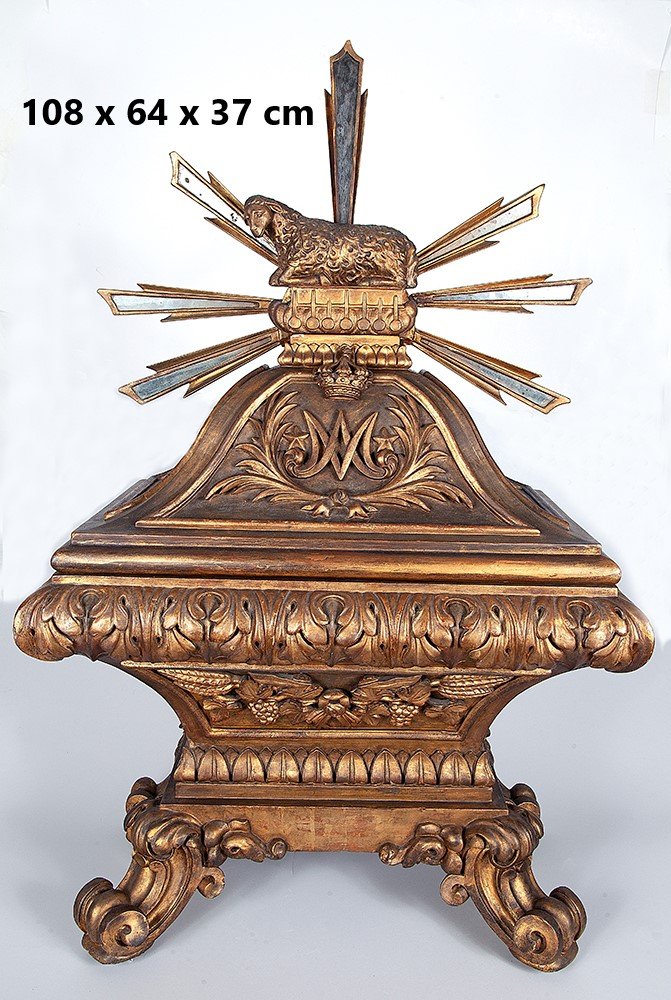 • A Urna onde ficam guardada as Hóstias consagradas é uma bela peça em madeira trabalhada, pintada na cor branca e com listas de ouro. Tem um formato de uma ânfora fechada e sobre si a escultura de um cordeiro sobre um livro fechado, que representa o Cordeiro Pascal.